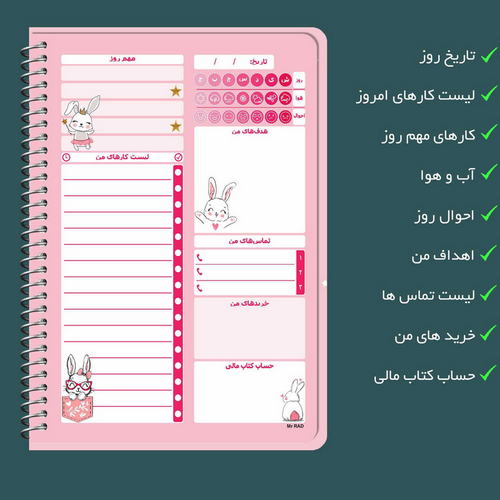 پلنر روزانه مستر راد طرح خرگوش فانتزی با طراحی شیرین و رنگهای شاد، دفتری ایدهآل برای کسانی است که میخواهند روزهای خود را با انرژی و نظم سپری کنند.